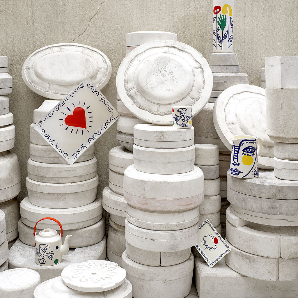 His collaboration with the Faïencerie de Gien allows him to develop his world, nourished by childhood, History and Pop Art.
