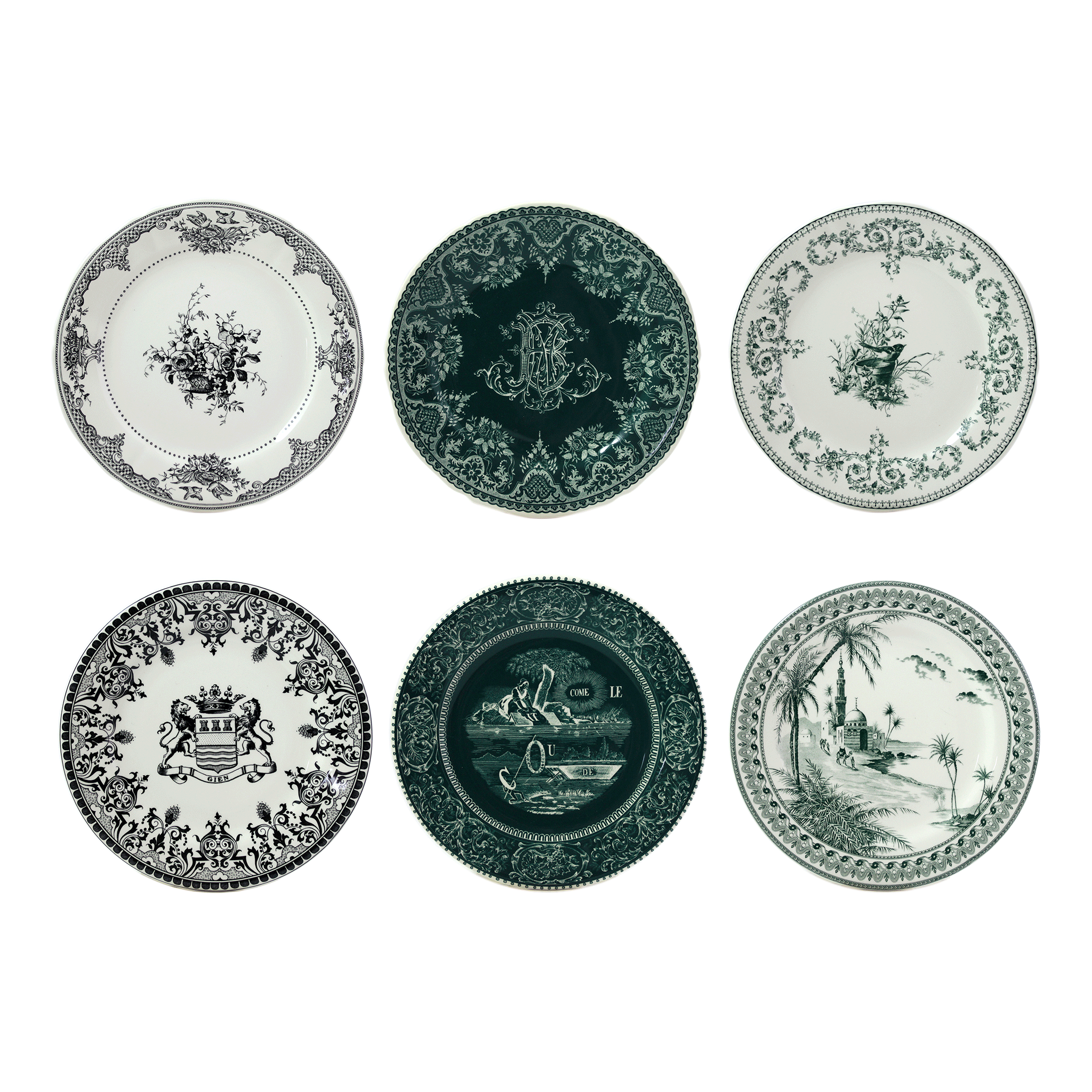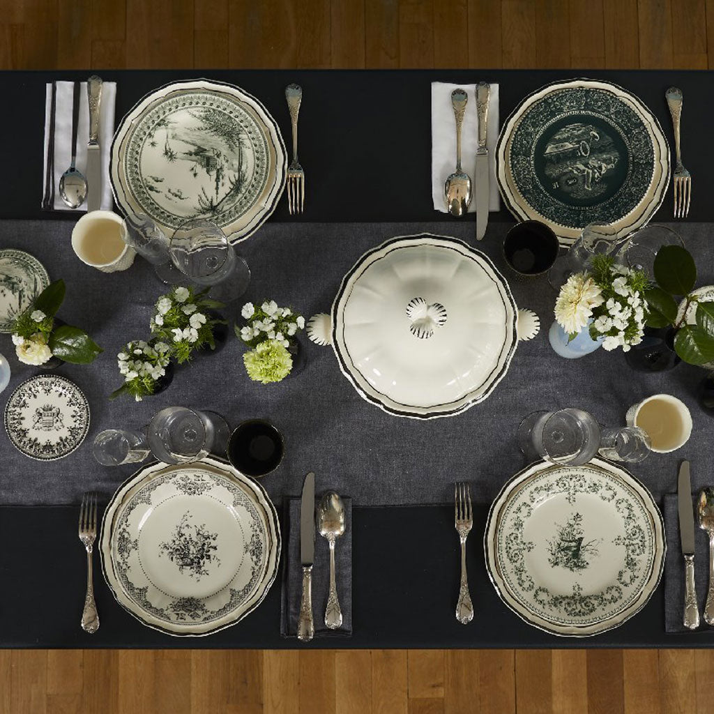Have fun creating unexpected combinations for a table setting unlike any other with these 6 different plates! The Les Dépareillées Vert collection is composed of 6 green and black designs from the Gien archives.